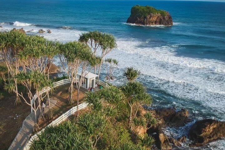 Dari atas tebing, Anda bisa menikmati panorama laut luas dengan ombak yang menghantam karang, menciptakan pemandangan yang dramatis. Terdapat pula pulau-pulau kecil di sekitar pantai yang menambah keindahan lanskap.
